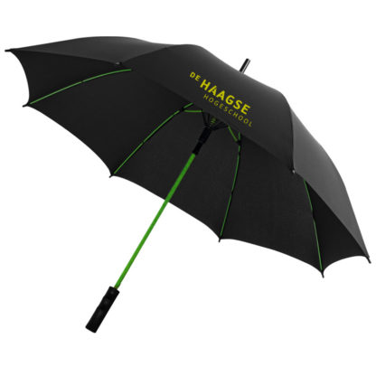 Automatische 23″ stormparaplu met gekleurde glasvezel schacht en glasvezel baleinen. Kleur matching stiksels op de paraplu sluit band. Winddicht systeem. Geleverd met een hoes. Polyester.
