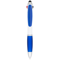 Met witte romp en kleurrijke greep en clip. Vier functies in één voordelige pen, rode, zwarte en blauwe inkt, plus en stylus punt. Balpen met klikmechanisme en soft touch greep. Zwartschrijvend. ABS Plastic.