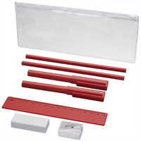 Pennenset met 2 balpennen (1 met zwarte inkt, de andere met blauw), 2 potloden, een liniaal, een puntenslijper en een gum. ABS Plastic, AC Plastic, PS Plastic.