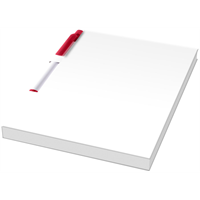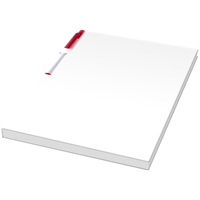 Conference set in A6-formaat. Bevat een A6 kladblok met 50 bladen (80g/m2) blanco papier en een ballpointpen in de rug. De conference set heeft een harde omslag (350g/m2). Volledig gekleurde decoratie mogelijk aan beide zijden van de omslag en op elk blad