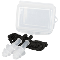Van 2 herbruiknare siliconen oordopjes met drievoudige flens en halskoord in PP cassette. Geluidsreductie tot 29dB. Koordlengte: 65 cm. Product voldoet aan EN352 norm. PP Plastic, Silicone Plastic.