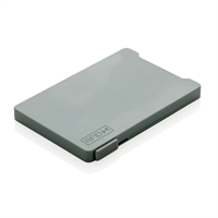 Deze kaarthouder kan maximaal 4 kaarten of 3 reliëfkaarten bevatten. De houder is ontworpen om elektronisch zakkenrollen door RFID-lezers tegen te gaan. Met de schuif aan de zijkant duwt u de kaarten eruit. Geregistreerd ontwerp®