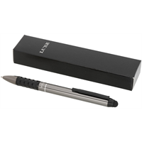 Design notitieblok (A5 referentie) met PU thermohoes, bladwijzer van zwart lint, magnetische sluiting en 80 vellen (80 g/m2) crème gelinieerd papier. Gecombineerd met de tactische klikbalpen. Beide items verpakt in een “LUXE” geschenkverpakking. Formaat n