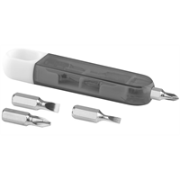 Pocketformaat schroevendraaierset met 3 dubbelzijdige platte, kruiskop en torx bits in uitschuifcassette met karabijnhaak. ABS Plastic.